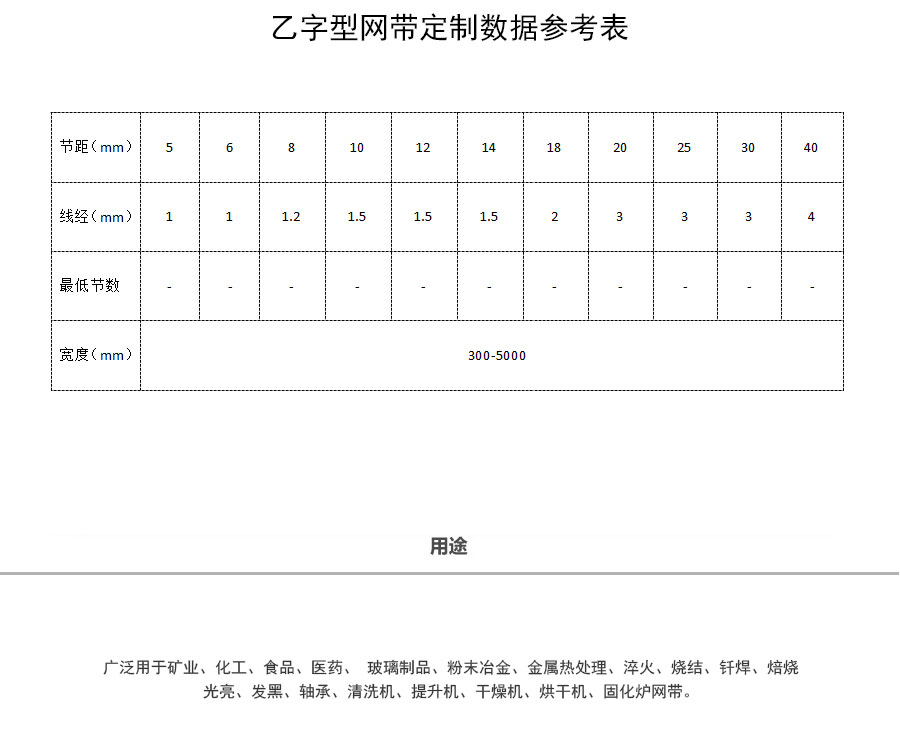 乙字型網帶簡介:乙字型網帶又稱乙型網帶、食品網帶、巧克力網帶,節距分隔一般按用戶要求定制,屬非標準輸送網帶。