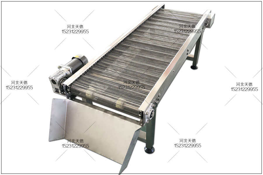 輸送帶的材質(zhì)采用不銹鋼材質(zhì),鋼絲采用1.2毫米直徑進行雙旋編織,孔為10*15毫米,鏈條節(jié)距為31.75毫米,鏈桿直徑為6毫米,桿之間的距離為3節(jié)一根。