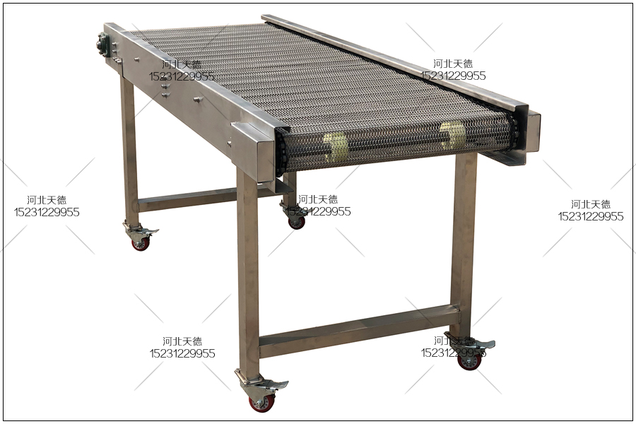 該不銹鋼輸送機(jī)總長(zhǎng)為1.5米,總寬度為500毫米,高度為60公分,采用鏈條式不銹鋼輸送帶來(lái)傳送物品,采用1.2鋼絲編織的10*20的孔,鏈條節(jié)距采用31.75毫米,使用直徑6毫米的串桿來(lái)支撐物料的輸送。大概120毫米左右一個(gè)串桿。